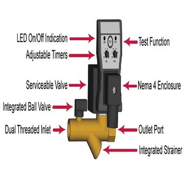 The BTC timer controlled condensate drain combines an adjustable electronic timer controlled drain, a ball valve, and a mesh strainer into one compact easy to install package. Suitable for any flow range and pressures up to 300 psig, the BTC is perfect for virtually any compressed air application, especially those with solid particulate contaminants.